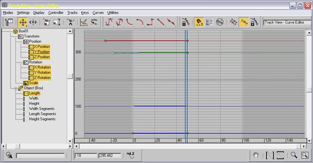 Когда в сцене задействовано много объектов, становится необходимым применение треков анимации (Рис. 12.2). Трек представляет собой график изменения некоторого параметра во времени. Каждый трек отвечает за то или иное преобразование объекта. Например, у объекта могут быть треки изменения местоположения, масштаба, прозрачности, цвета и т.д. Для каждого трека можно задать ключевые кадры, в которых назначаются крайние параметры того или иного свойства объекта. Промежуточные значения рассчитываются автоматически.