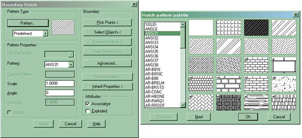 Для выполнения штриховки используется команда Bhatch (Штриховка) из падающего меню Draw (Рисование) или соответствующая кнопка пиктограммы палитры инструментов. Команда открывает диалоговое окно Boundary Hatch (Граница штриховки).