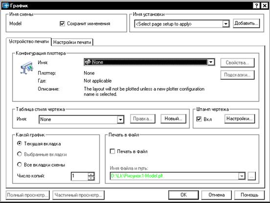 - Plot Devis (Устройство печати) - позволяет назначить печатающее устройство, произвести настройку его параметров, выбрать стиль печати и задать количество копий;