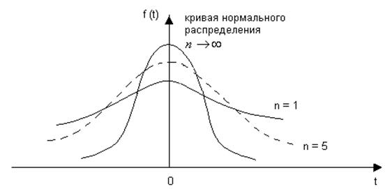 Из формулы (21) видно, что распределение Стьюдента определяется только одним параметром n – числом степеней свободы. График функции плотности вероятности СВ, имеющей распределение Стьюдента, является симметричной кривой (линия симметрии – ось ординат) (рис.4)