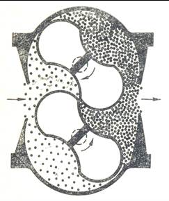 Для откачки технологических установок, в которых не требуется достижения высокого вакуума, но в которых имеют место большие газовые нагрузки, применяют двухроторные насосы Рутса. Схема действия такого насоса приведена на Рис. 2.