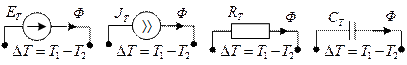 Таким образом, тепловая подсистема характеризуется 4 идеальными двухполюсниками, которые, по аналогии с электротехникой, можно представлять схематически следующим образом