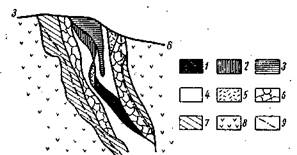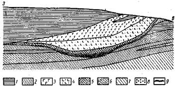 Рис. 8.5. Упрощенный разрез габбро-диабазовой интрузии Норильского месторождения: 1—эффузивная толща; 2 — лабрадоровые порфириты и диабазы; 3 — габбро, габбро-диориты и габбро-диабазы; 4 — габбро-диабазы оливиновые и оливино-диоритовые; 5 — габбро-диабазы рудоносные (пикритовые, такситовые, контактовые); 6 — песчаники и сланцы верхней части Тунгусской свиты; 7 — песчаники и сланцы нижней части угленосной Тунгусской свиты; 8 — вкрапленные руды; 9 — сплошные руды