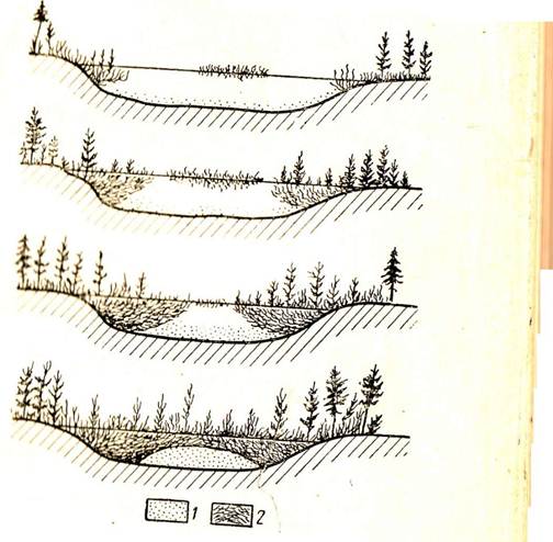 Помимо крупной климатической зональности, при зарастании любого водоема возникает зональность от расположения растительности по влаголюбию. Разные виды растительности зарастающего водоема, перепутываясь, держатся сплошным покровом на поверхности воды, представляя так называемую сплавину. Последняя постепенно затягивает свободную поверхность воды. Утолщаясь, сплавина становится почвой для других видов растений, превращает водоем сначала в трясинное болото, а затем в сплошное плотное болото. Обычная схема зарастания водоема представлена на рис. 9.1.