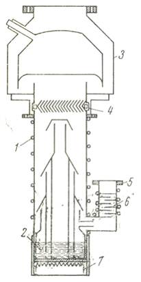 Рис. 3. Схема диффузионного насоса. 1 – змеевик водяного охлаждения, 2 – фракционирующий испаритель, 3 – охлаждаемая ловушка, 4 – маслоотражатель, 5 – форвакуумная линия, 6 – отражатель, 7 - электронагреватель.