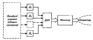 Функциональная схема таких систем (рисунок 1) включает набор датчиков Д1...Дп контролируемых параметров установленных на посевном агрегате (объекте САК), блок усиления и преобразования сигналов датчиков (БУП) датчиков, монитор для оператора (установленный в кабине трактора или самоходного комбайна).