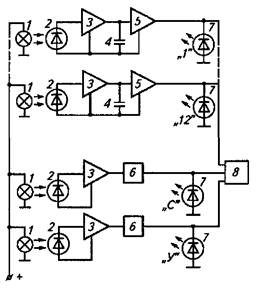 Устройство имеет 12 идентичных каналов обработки сигналов датчиков частоты высева семян. Каждый из каналов преобразования сигналов датчиков (световых излучателей 1 и фотодиодов 2) содержит усилитель 3, емкость 4 с электронным ключом 5, световой индикатор (светодиод) 7. Электронное реле 6 и блок звуковой сигнализации 8.