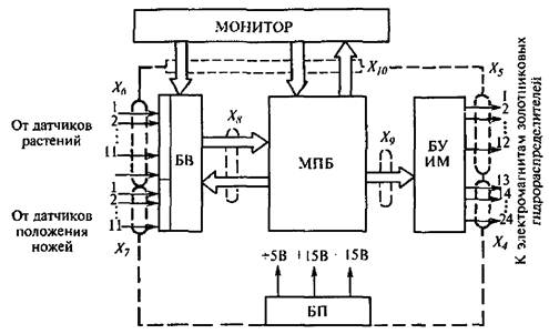 Электрические цепи датчиков обнаружения растений и положения ножей подключены к блоку входному (БВ) через электрические разъемы X6 и Х7, а электромагниты золотниковых гидрораспределителей (12 шт.) – к блоку управления исполнительными механизмами (БУ ИМ) через разъемы Х4 и Х5. Сигналы электроконтактных датчиков подаются в БВ на входы операционных усилителей, каждый из которых обеспечивает преобразование значения сопротивления электрической цели «щуп – земля» соответствующего датчика в напряжение. Оно сравнивается компараторами (элементами сравнения) с эталонными значениями напряжения, соответствующими верхнему и нижнему значениям сопротивления цепи «щуп – земля», при которых с высокой достоверностью идентифицируется касание щупом ростка свеклы. Микропроцессорный блок (МПБ) осуществляет обработку сигналов датчиков и выдачу результатов на монитор и БУ ИМ. Блок питания (БП) обеспечивает напряжениями соответствующих уровней все узлы устройства.