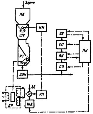 Принцип действия САУ чистотой зерновой массы следующий. Обрабатываемое зерно поступает в ЗОМ из ПБ через ШУ и РЗ. САУ стабилизирует загрузку машины зерновой массой на уровне, установленном задатчиком (ЗД). Периодически, через определенные промежутки времени, программное устройство (ПУ) включает анализатор чистоты зерна, содержащий пробоотборник (ПО), весоизмерительное устройство (ВУ) и сепаратор (СП). ПО отбирает из зернового потока (на выходе из машины) пробу, после чего она поступает на ВУ. При достижении фактической массы пробы, равной заданной, включается в работу СП. При этом чистое зерно взвешивается ВУ и результат сравнивается с заданным значением, соответствующим кондиционному зерну. Если масса пробы ниже (выше) заданной, то загрузка машины соответственно увеличивается (уменьшается) путем коррекции ЗД требуемого уровня задания САУ ЗОМ. Описанный алгоритм коррекции оптимальной загрузки периодически повторяется по командам ПУ.