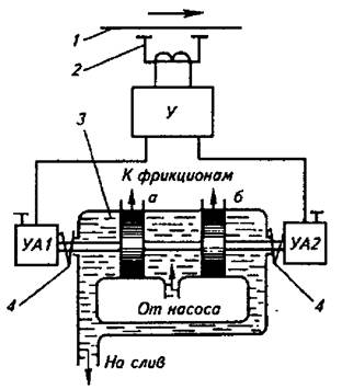 Устройство поддерживает определенное расстояние датчика 2 от проволоки 1. При изменении этого расстояния сигнал отдатчика в зависимости от знака отклонения поступает через усилитель У на электромагниты УЛ1 или УЛ2 гидравлического золотника 3. Золотник управляет силовыми гидроцилиндрами рулевых тяг (фиксаторов) трактора (комбайна).