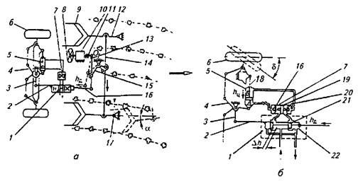 Гидравлический исполнительный механизм системы управления состоит из золотникового гидрораспределителя 1 с блоком 7 гидрозамковых клапанов и гидроцилиндра 5 (рисунок 15, б). Выходным воздействием исполнительного механизма является перемещение гидроцилиндра hц или пропорциональный ему угол δ поворота управляемых колес. Гидрораспределитель 1 имеет подвижные относительно друг друга корпус 22 и золотник 21. Золотник соединен со штангой 16 датчика, и перемещение золотника вдоль корпуса распределителя при неподвижном гидроцилиндре равно перемещению штанги датчика.