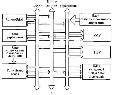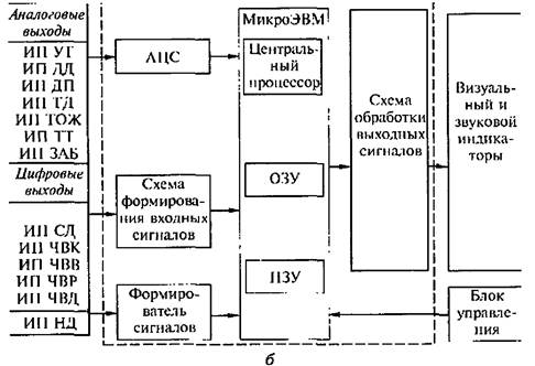 Структура БАС приведена на рисунке 3, а. Она включает следующие основные узлы: микроЭВМ с центральным процессором, блоки управления, визуальной и звуковой индикации, сопряжения с выходами измерительных преобразователей, устройство ввода, запоминающие устройства оперативное (ОЗУ) и постоянное (ПЗУ), блок стабилизированного напряжения.