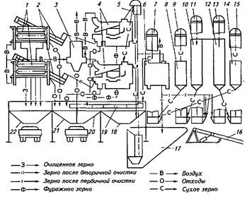 1 – триерные блоки; 2 - передаточные транспортеры; 3 - аспирационная система; 4 - воздушно-решетные машины; 5, 7, 9, 11, 13, 15 - нории; 6 – машина первичной очистки; 8, 14 - охладительные колонки; 10, 12 - шахты; 16 – автомобилеподъёмник; 17 - завальная яма; 18, 20, 21, 22 - блок бункеров; 19 - транспортер отходов