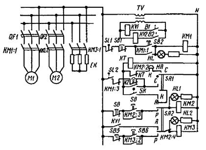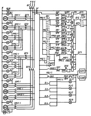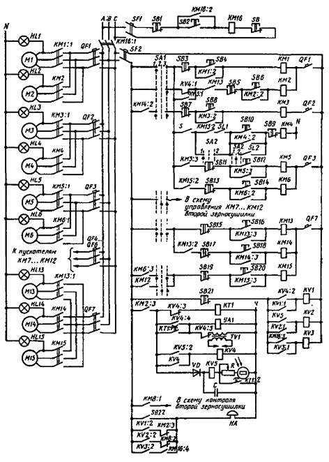 Она состоит из цепей дистанционного пуска и останова агрегатов, управления топкой, световой и звуковой сигнализации. Автоматами QF1 и QF2 и переключателем SA1 выбирают заданный вариант работы оборудования: работа только первой или второй зерносушилки или их совместная работа (положение переключателя SA1 будет соответственно в 1, 2 или 3). Перед пуском зерносушилки включают автоматы SA1 и SA2, подающие напряжение в схему управления, и кнопкой SB2 включают магнитный пускатель КМ 16. Блок-контакты КМ 16:3 через реле KV3 включают предупредительный звуковой сигнал НА, который после пуска агрегатов отключают кнопкой SB21 через реле KV1…KV3.