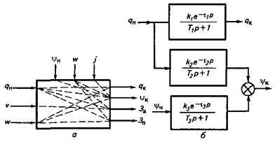 Поскольку чистота ψК зерна после воздушно-решетной машины в основном зависит от его подачи qн и чистоты поступающего в машину зерна ψН, а производительность qK – от подачи qH, то структурную схему зерноочистительной машины как объекта оптимального управления можно представить тремя апериодическими звеньями первого порядка с запаздыванием (рисунок 3, б).