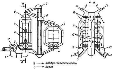 Шахтные зерносушилки типа СЗШ (рисунок 4) имеют две сушильные камеры, два надсушильных бункера 6, две загрузочные нории 7 влажного зерна, две нории сухого зерна 8, разгрузочные устройства 3, две охладительные колонки 9 со шлюзовыми затворами. Теплоноситель из топки 2 по трубопроводу 1 подается в сушильные камеры 4 и 5. Пространство между шахтами используется в качестве диффузора 12, в центральную часть которого снизу подводится теплоноситель. Отработанный теплоноситель отводится с боковых сторон с помощью вентиляторов 13. Внутри камеры размещены пятигранные коробы 11. Одной стороной каждый короб упирается в глухую стенку, в другой его стороне выполнено открытое окно.