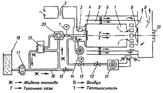 7 - камера сгорания; 8 - отражатель; 9 - смесительная камера; 10 - предохранительный клапан; 11 - газодувка; 12, 13 - краны; 14 - дутьевой вентилятор; 15 - сливной кран; 16 - трубопровод; 17 - насос; 18 - топливный бак; 19 - золотник; 20 - дроссель