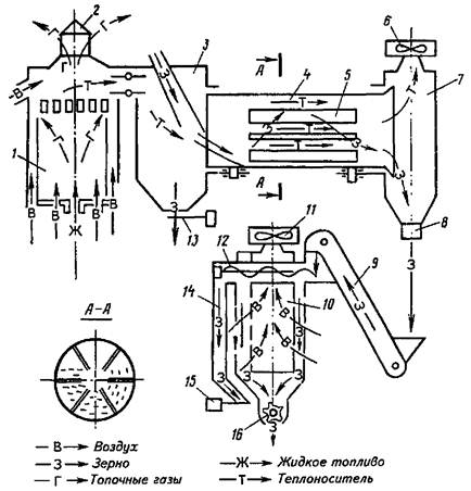 1 - топка; 2 - выпускная труба; 3, 7, 8 - камеры; 4 - сушильный барабан; 5 - лопатки; 6, 11 - вентиляторы; 9 - элеватор; 10 - охладительная колонка; 12 - шнек; 13,15 - клапаны; 14 - зернослив; 16 - затвор