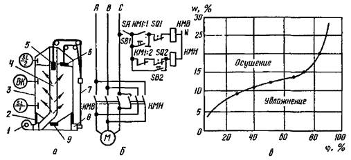Влажность воздуха на входе в слой зерна и выходе из него контролируют влагомерами с контактными датчиками В1 и В2, которые замыкаются при повышенной относительной влажности воздуха соответственно на входе и выходе бункера. Если влажность зерна повышенная, то выносимая воздухом влага замыкает контакты В2, в результате чего срабатывает реле KV2, которое контактами К2 включает пускатель КМ2 электропривода вентилятора. Процесс сушки продолжается независимо от положения контактов КТ до тех пор, пока до установленного значения не снизится вынос влаги из зерна. Тогда размыкаются контакты В2, отключается реле КV2 и лишается питания пускатель КV2 электропривода М2 вентилятора 1. Одновременно размыкающие контакты КМ2:2 включают звонок НА, сигнализирующий об окончании процесса сушки.