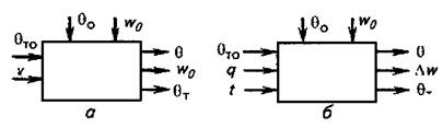 В шахтной зерносушилке выходными управляемыми параметрами являются температура θ и влажность w зерна на выходе, а входными управляющими параметрами — температура θТ0 теплоносителя и скорость движения v зерна через шахту. Начальные температура θ0 и влажность w 0 зерна на входе в сушилку с точки зрения автоматического управления являются мешающими воздействиями. Между остальными параметрами связь (последнее уравнение) слабая — с коэффициентом взаимной корреляции менее 0,4, поэтому они в модели рисунка 10, а не показаны, т.е. ими пренебрегают.