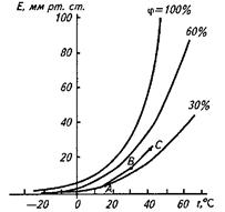 Влагосодержание воздуха (парциальное давление паров Е) тесно связано с его температурой и относительной влажностью φ (рисунок 2). Зная величину Е, можно легко определить объемное В0 (г/м3) и массовое ВМ (г/кг) влагосодержание воздуха по формулам: В0 = 1,2Е; ВМ = 0,9Е. Влажностью управляют путем увлажнения или осушения воздуха. Осушение воздуха осуществляется методом «сухого» отопления или конденсации (в зимний период).
