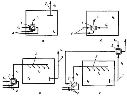 С точки зрения энергосбережения наиболее предпочтительна система с рекуперацией энергии в теплообменнике (рисунок 3, г). В нем энергия удаляемого из помещения воздуха частично подогревает наружный воздух перед подачей в тепловой центр 1.