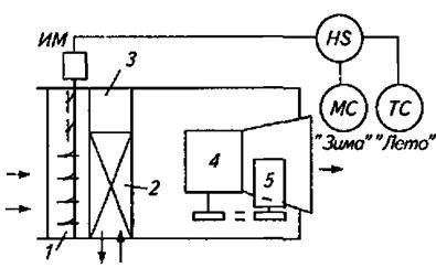 В холодный период года вентилятор работает на 50%-й частоте вращения и температура в помещении поддерживается за счет поворота жалюзи. При повышении влажности воздуха в помещении частота вращения вентиляторов увеличивается до минимальной регулятором влажности (MС).