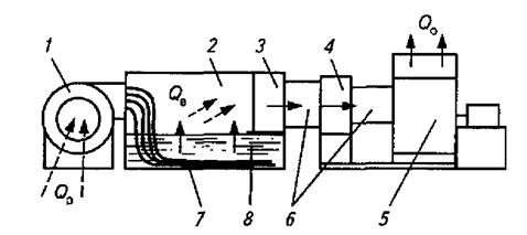 С целью сокращения расхода энергии и упрощения конструкции разработана система аэрогидродинамического кондиционирования воздуха на фермах молодняка (рисунок 7). Рециркуляционный воздух QР направляется вентилятором 1 через отверстия в шлангах 7 и барботируется в воде 8 со слаборастворимой известью. В воде легко растворяется аммиак и задерживаются пыль и бактерии, известь поглощает диоксид углерода. От влажного воздуха QВ отделяется влага в механическом сепараторе 3. Затем при необходимости воздух подогревается (Q0) в электрокалорифере 4 и направляется в помещение. Электрокалорифер работает только в холодное время года. В жаркое время влажный воздух QВ снижает температуру воздуха помещений. Такой кондиционер доводит все параметры климата до требуемых кондиций, устраняет запахи животноводческих помещений, экономит 40 % и более электроэнергии.