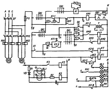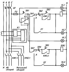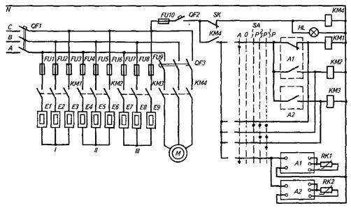 Если температура в помещении ниже нормы, то при переключении SA в положение А термореле SK включает магнитный пускатель КМ4 электродвигателя М вентилятора и через контакты термореле напряжение подается в схему управления. При этом через замкнутые контакты терморегулятора А1 включается секция I электронагревателей. Если температура теплоносителя (подогреваемого воздуха) не достигает заданного значения, то терморегуляторы А1 и А2 поочередно включают магнитными пускателями КМ2 и КМ3 секций II и III.
