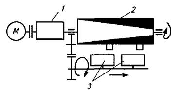 Рисунок 13 – Схема устройства для автоматического изменения длительности светового дня в птичнике: 1 - редуктор; 2 - барабан; 3 – микропереключатели