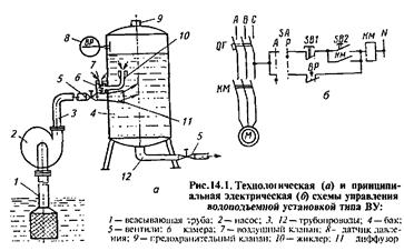 Автоматическая водоподъемная установка типа ВУ с воздушно-водяным котлом (гидропневматическим аккумулятором) предназначена для подъема воды из открытых водоемов и шахтных колодцев глубиной до 5 м при напоре от 25 до 80 м. Установка состоит из всасывающей трубы 1 (рисунок 1) с приемным фильтром насосного агрегата 2, нагнетательного 3 и водоразборного 12 трубопроводов с запирающими вентилями 5, воздушно-водяного бака 4 с датчиком давления 8 и струйным регулятором запаса воздуха, имеющим камеру смешивания 6, воздушный клапан 7, жиклер 10 и диффузор 11.