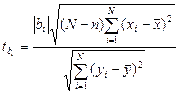 4. Проверяется значимость уравнения регрессии по F-критерию Фишера. Если уравнение оказалось незначимым, то расширяется матрица X (соответственно, усложняется уравнение регрессии) и осуществляется переход к этапу 2. Если значимость доказана, то оценивают значимость отдельных коэффициентов регрессии, для чего определяют расчетные значения t - критерия Стьюдента по следующим формулам: