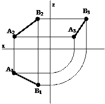 Т.к. для всез точек горизонтали одинаковое расстояние от плоскости p1 (XY), то для любой пары точек горизонтали должно выполнятся равенство ZA=ZB и, следовательно, на комплексном чертеже фронтальная проекция A2B2 будет параллельна оси OX. Горизонтальная проекция может занимать относительно оси любое положение, а профильная - параллельна оси OY.