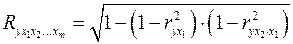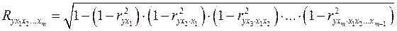 Из приведенных выше формул частных коэффициентов корреляции видна связь этих показателей с совокупным коэффициентом корреляции. Зная частные коэффициенты корреляции (последовательно первого, второго и более высокого порядка), можно определить совокупный коэффициент корреляции по формуле: