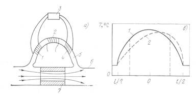 На Рис. 10 а обозначено: 1 – резистор, 2 – нагреватель, 3 – измерительный прибор, 4 – резистор, 5 – никелквая измерительная трубка, 6 – отводная магистраль, 7 – градуировочная трубка. На Рис. 10 б приведен профиль распределения температуры вдоль никелевой трубки при отсутствии (1) и при наличии (2) газового потока.
