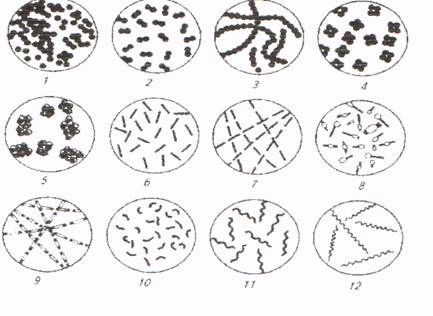 шаровидные: 1 – стафилококки, 2 – диплококки, 3 – стрептококки, 4– тетракокки, 5 – сарцины; палочковидные: 6– бактерии, 7– стрептобактерии, 8– бациллы, 9 – стрептобациллы;