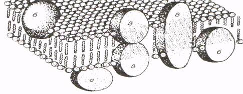 Глобулы белка: а – находятся на поверхности; б – погружены в фосфолипидный слой на небольшую глубину; в – пронизывают фосфолипидный слой поодиночке или парами.