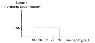 Поскольку число различных значений, принимаемых показателем температуры, бесконечно, здесь бессмысленно пытаться разделить «пластичную массу» на малые части. Вместо этого можно «размазать» ее по всему диапазону. Поскольку все температуры от 55 до 75° F равновероятны, она должна быть «размазана» равномерно, как это показано на рис. A.2.