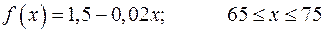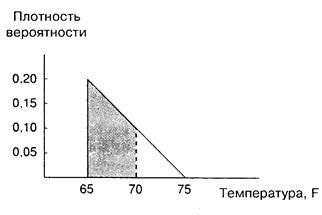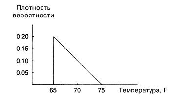 В нашем случае график функции плотности вероятности горизонтален, и ее указанная интерпретация точна, однако в общем случае эта функция непрерывно меняется, и ее интерпретация дает лишь приближение. Далее мы рассмотрим пример, когда эта функция непостоянна, поскольку не все температуры равновероятны. Предположим, что центральное отопление работает таким образом, что температура никогда не падает ниже 65°F, а в жаркие дни температура превосходит этот уровень, не превышая, как и ранее, 75°F. Мы будем считать, что плотность вероятности максимальна при температуре 65°F и далее она равномерно убывает до нуля при 75°F (рис. A.4).