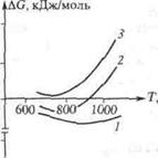 Далее для этих температур и составов смеси по формуле (3.32) рассчитывают ∆GР,Т по реакции. Результаты представлены на рис. При исходном соотношении пар: газ = 1: 1 во всем температурном интервале ∆GР,Т < 0, и потому возможно выделение сажи. При соотношении пар: газ = 2:1 при температурах ниже 900 К, т.е. в какой-то части реактора, также возможно сажеобразование. И только при четырехкратном избытке водяного пара выделение сажи становится невозможным (∆GР,Т > 0 во воем интервале температур).