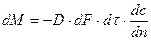 Количество вещества dM, продиффундировавшего за время dt через элементарную поверхность dF (нормальную к направлению диффузии) пропорционально градиенту концентрации dc/dn этого вещества.