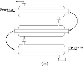 В таком реакторе теплоноситель циркулирует через рубашку реактора. Выбор пространства для теплоносителя и реакционной массы определяется тем, какой из этих потоков быстрее загрязняет пространство. Для того, который загрязняет быстрее, выбирается внутренняя труба, т.к. ее проще прочищать. Если требуется достаточно большое время пребывания реакционного потока в зоне реакции, то выбирается многосекционный аппарат "труба в трубе" (ж).