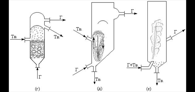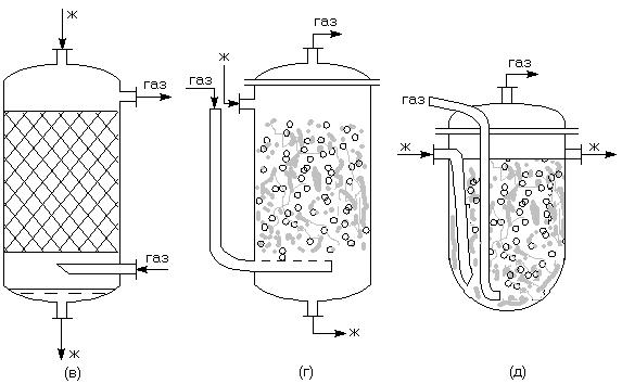 Простейшее взаимодействие жидкости и газа – барботаж последнего через жидкость (г, д). Вариант (г) предназначен для периодического процесса, вариант (д) – для непрерывного.