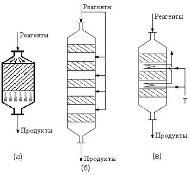 Использование варианта адиабатического реактора часто приводит к большим перепадам температур по высоте каталитического слоя и существенного отклонения средней температуры от ее оптимального значения. Для того, чтобы приблизить температурный режим к оптимальному используются многотоннажные (многосекционные) реакторы, в которых выравнивание температурного режима осуществляют съемом или подводом тепла с помощью теплообменных устройств между секциями или путем подачи между секциями захоложенного или перегретого реагента (компонента) (б,в).