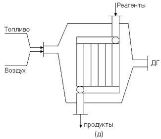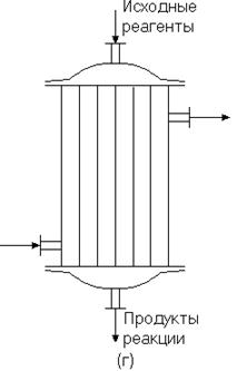 Для обеспечения теплотой эндотермических процессов используют горячие дымовые газы. В последнем случае реактор представляет собой трубчатую печь (д).Отводить тепло реакции можно не только теплоносителем, но и свежей реакционной смесью.