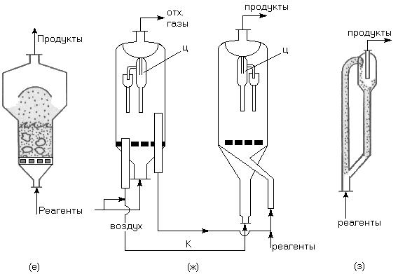 Другая группа реакторов – со взвешенным (кипящим) или восходящим слоем катализатора. При подаче реакционной смеси снизу слоя с достаточной скоростью твердые частицы будут витать в воздухе, не уносясь с ним (е); в этом случае применяют частицы не крупнее 1 мм. Это обеспечивает полное использование их внутренней поверхности. Циркулирующие частицы выравнивают температуру в слое – процесс в нем протекает практически изотермически. Интенсивное движение частиц обеспечивает хороший теплоотвод – коэффициент теплоотдачи от кипящего слоя более чем на порядок превышает таковой от неподвижного слоя. подвижность каталитического слоя дает возможность организовать течение твердых частиц через реактор, что существенно для процесса с меняющейся активностью катализатора. Благодаря этому можно организовать непрерывный транспорт его из зоны реакции в зону регенерации и обратно. В целом такая система "реактор – регенератор" обеспечивает непрерывность процесса в целом. Такой тип реакционного узла можно организовать в процессе каталитического крекинга нефтепродуктов, в котором катализатор быстро закоксовывается, теряя свою активность. Его непрерывно выводят из реактора в регенератор (ж), где происходит "выжигание" кокса и восстанавливается активность катализатора.