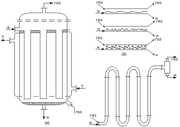 В трубчатом реакторе (а) жидкость стекает по стенкам трубок и контактирует со встречным потоком или попутным потоком газа. Это наиболее организованный процесс, т.к. здесь строго поддерживается поверхность контакта фаз, равная поверхности трубок. Тепловой режим поддерживается регулированием температуры трубок. Обычно такие реакторы используют в малотоннажных производствах тонкого органического и неорганического синтеза. Эти реакторы характеризуются устойчивостью гидродинамического и температурного режимов, однако у них низкая производительность из-за низкой поверхности контакта фаз.