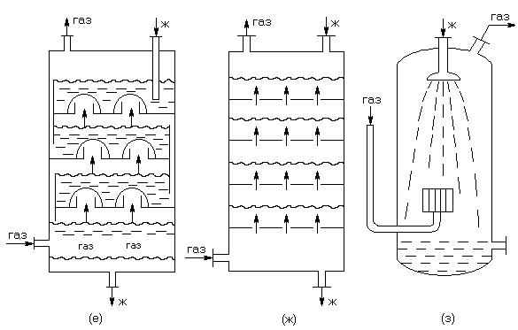 Принципиально взаимодействие газа с жидкостью осуществляется тремя способами: прямоточное и противоточное движение сплошных потоков газа и жидкости, барботаж газа через жидкость (газ диспергирован в объеме жидкости), разбрызгивание жидкости в газе (жидкость диспергирована в объеме газа).
