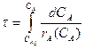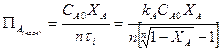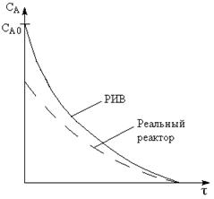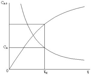 Рассмотрим кинетические зависимости для реагента А в реакторах смешения и вытеснения. Из этих зависимостей видно, что действующая концентраций в реакторе смешения СА будет существенно ниже по сравнению со средней концентрацией А в реакторе вытеснения.