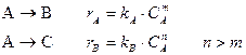 3. Система параллельных реакций (основной и побочной), когда порядки основной и побочных реакций по реагенту одинаковы, m=n.